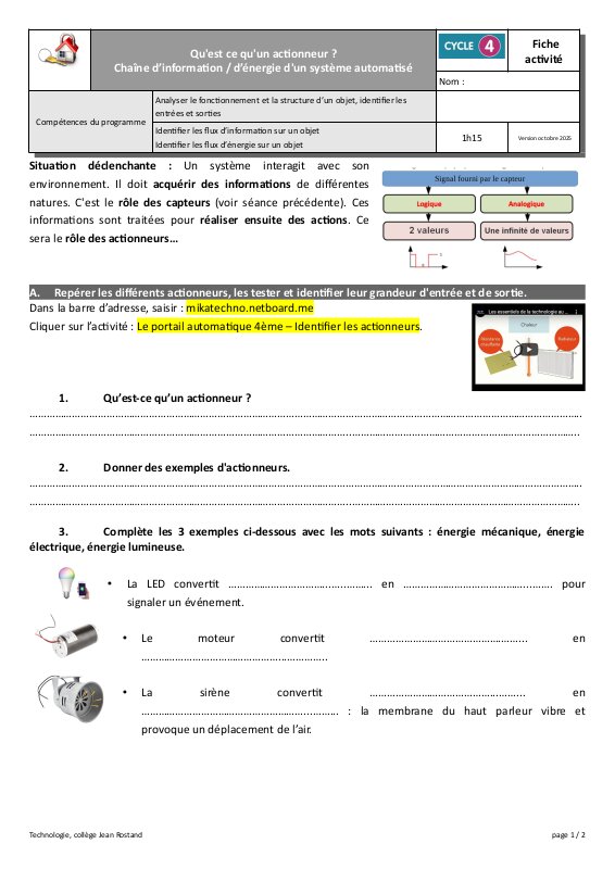 Situation déclenchante : Un système interagit avec son environnement. Il doit acquérir des informations de différentes natures. C'est le rôle des capteurs (voir séance précédente). Ces informations sont traitées pour réaliser ensuite des actions. Ce sera le rôle des actionneurs